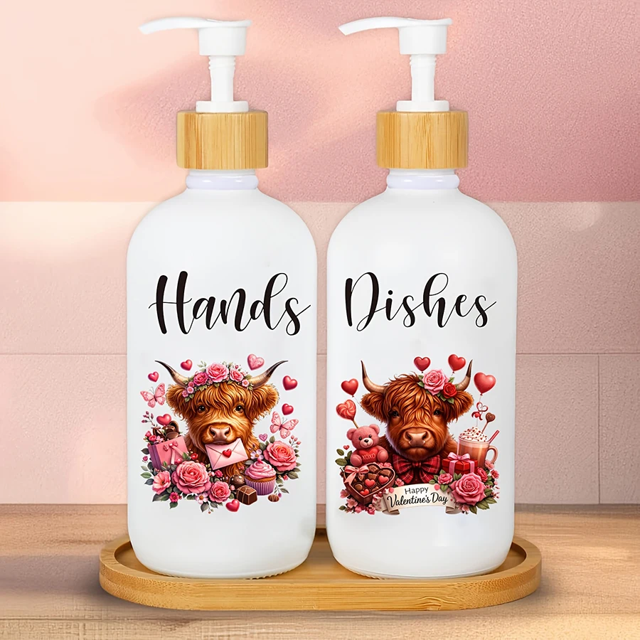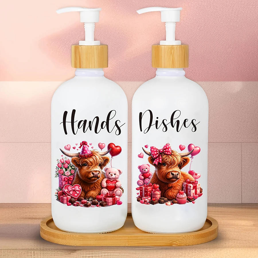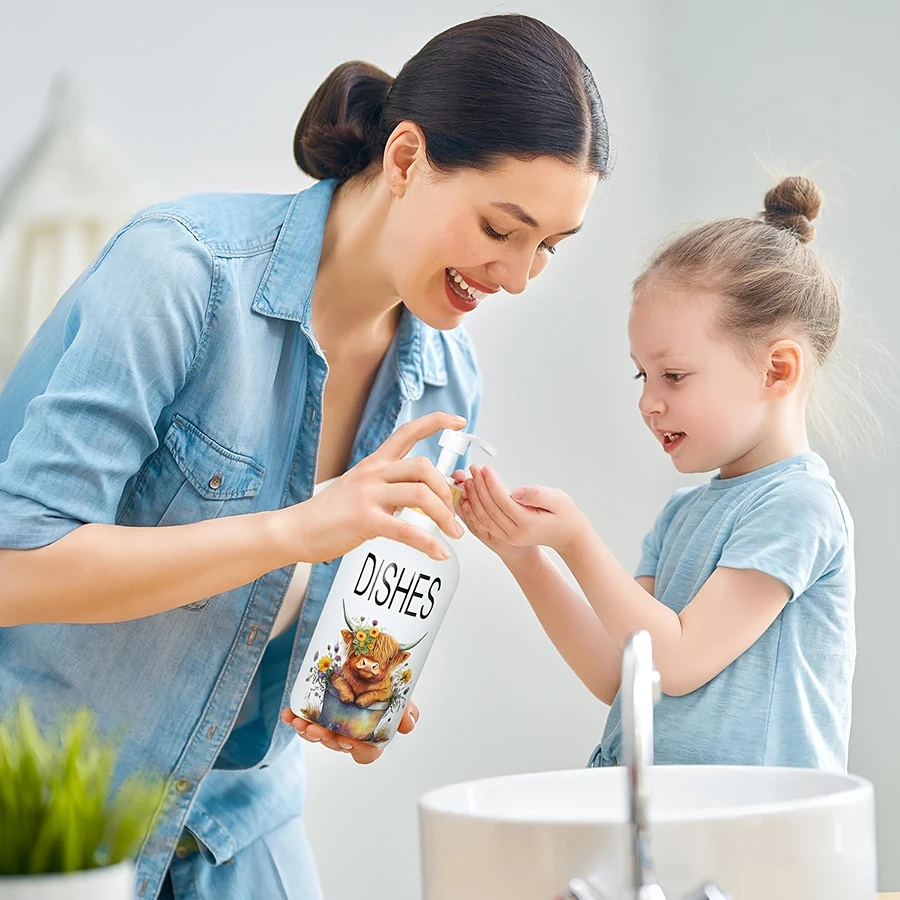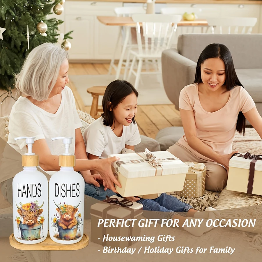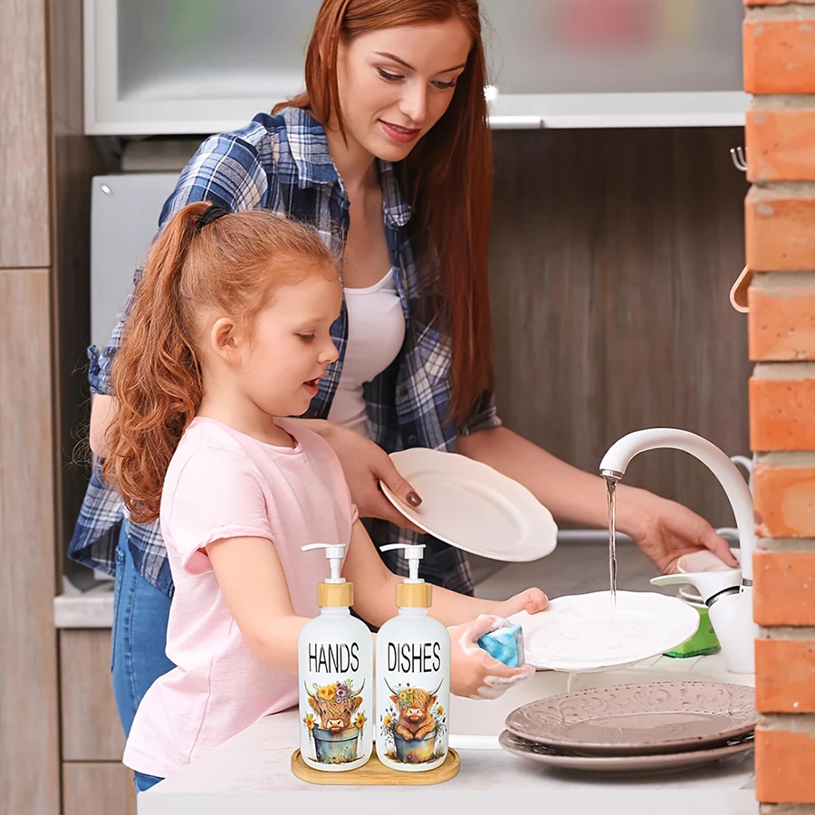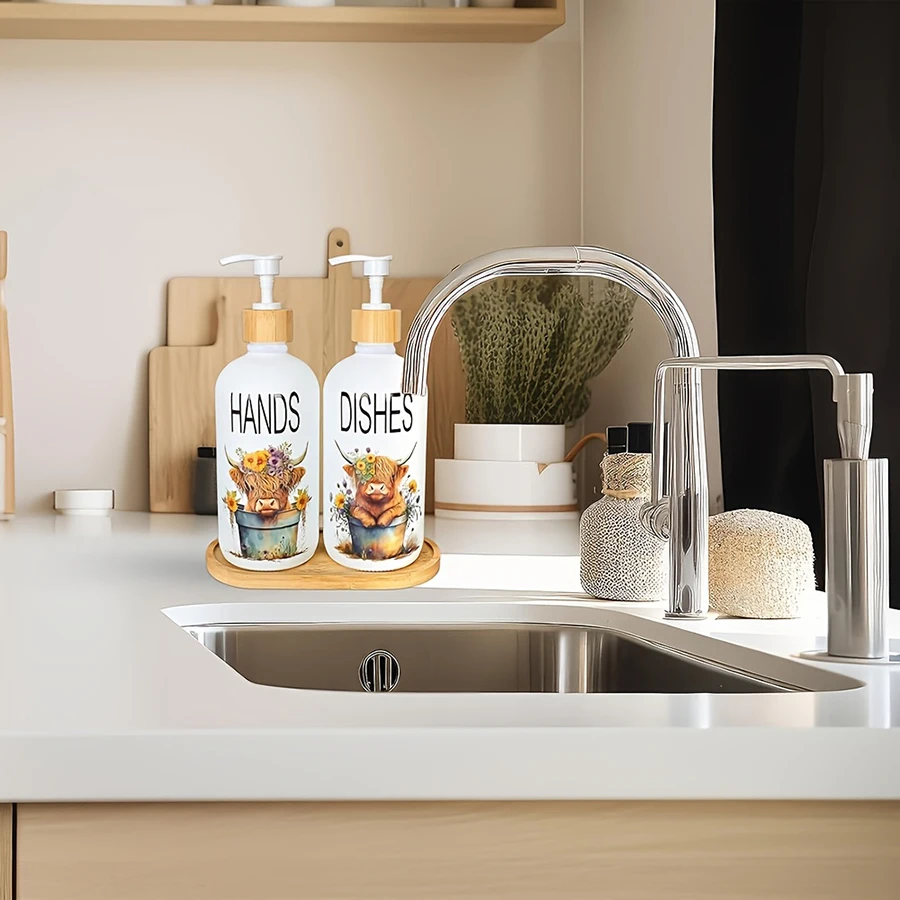 2Pcs Highland Cow Soap Dispenser withTray Farmhouse Cow Floral Plastic Dispenser with Pump Refillable Liquid Soap Container