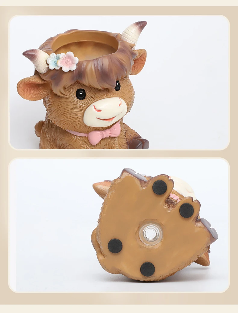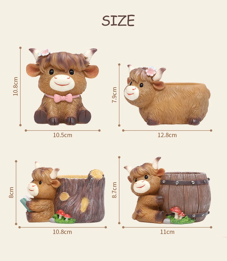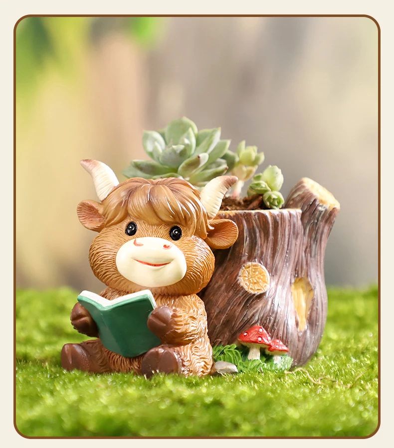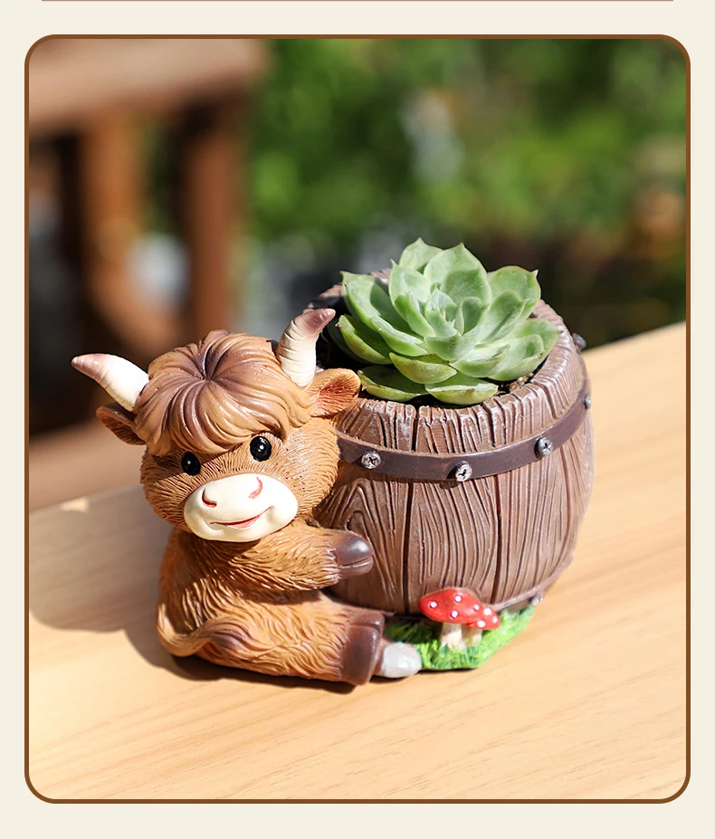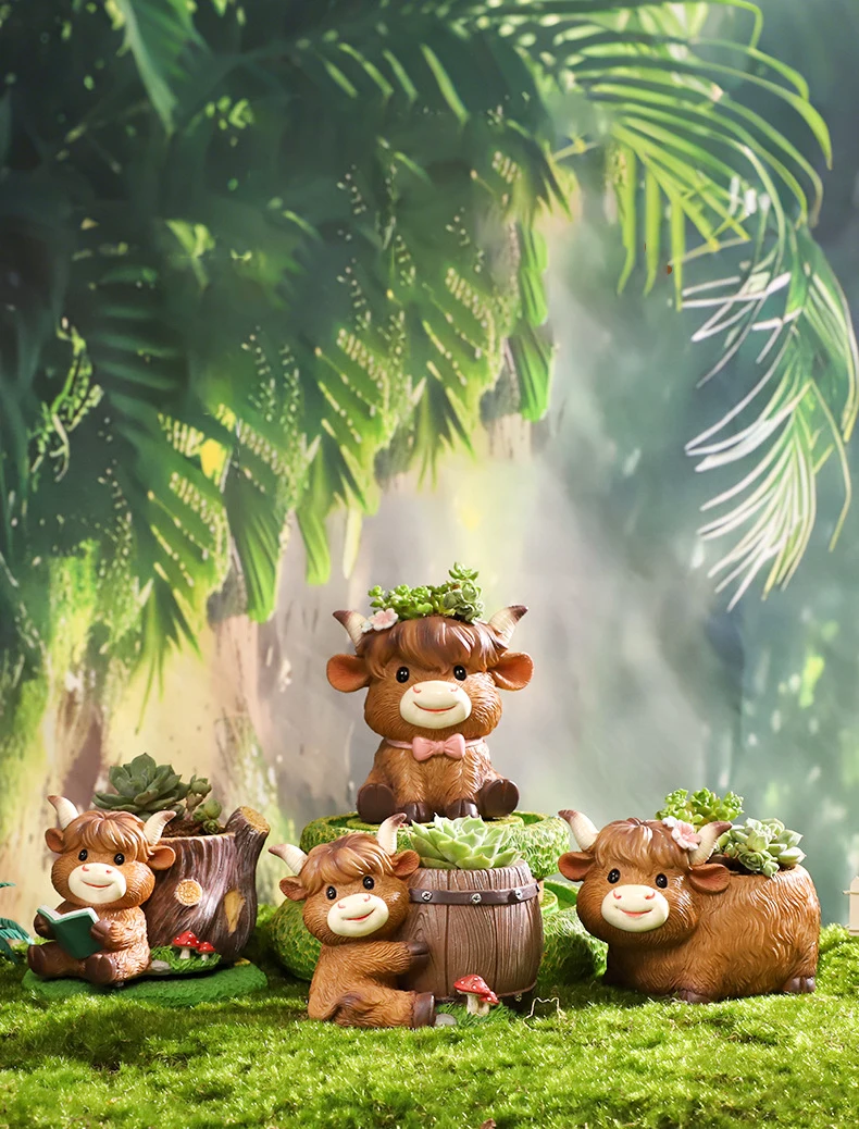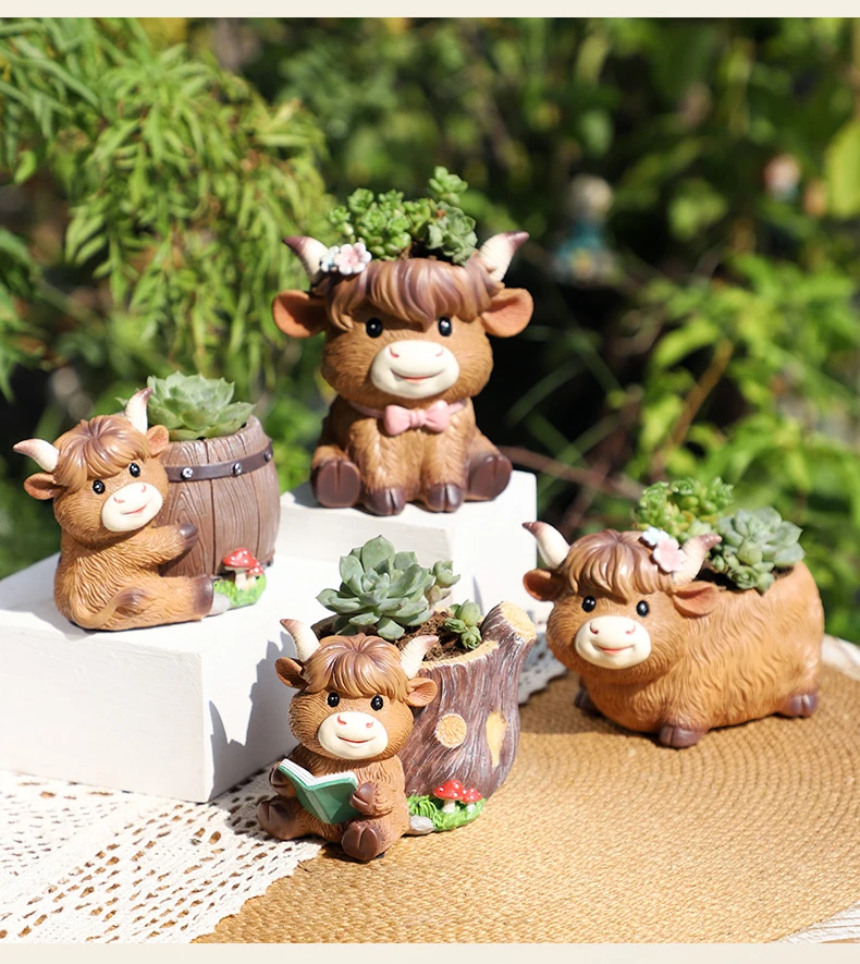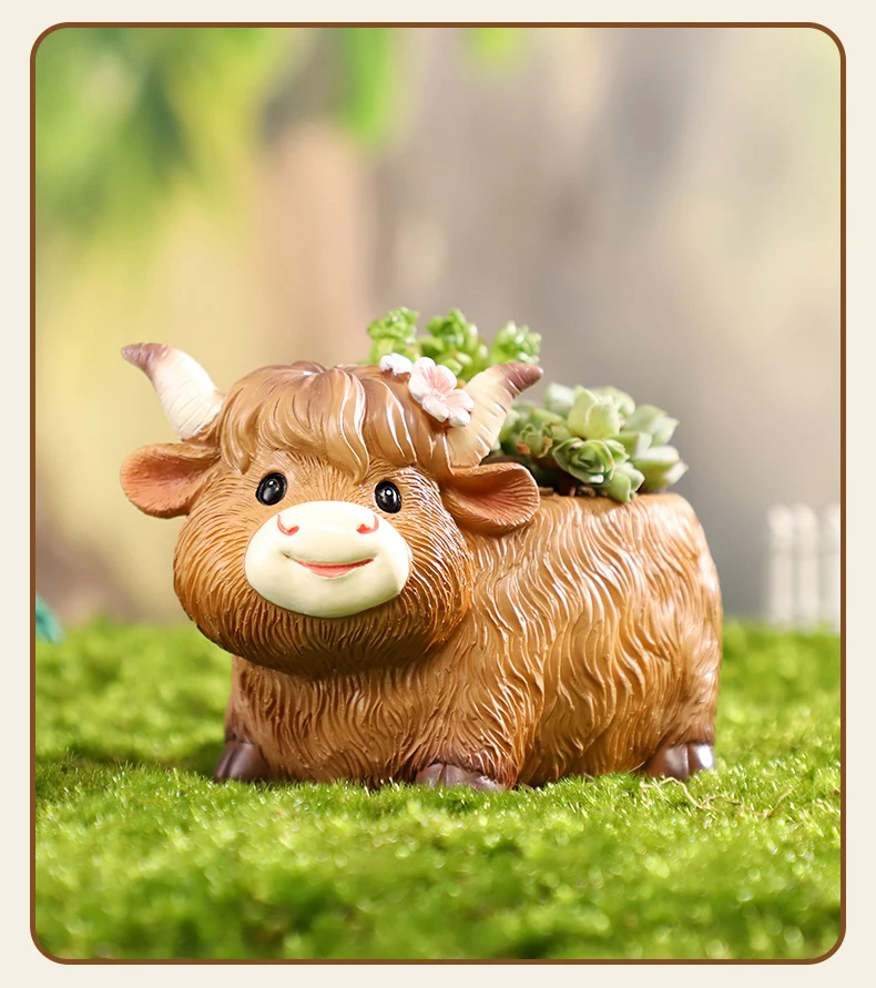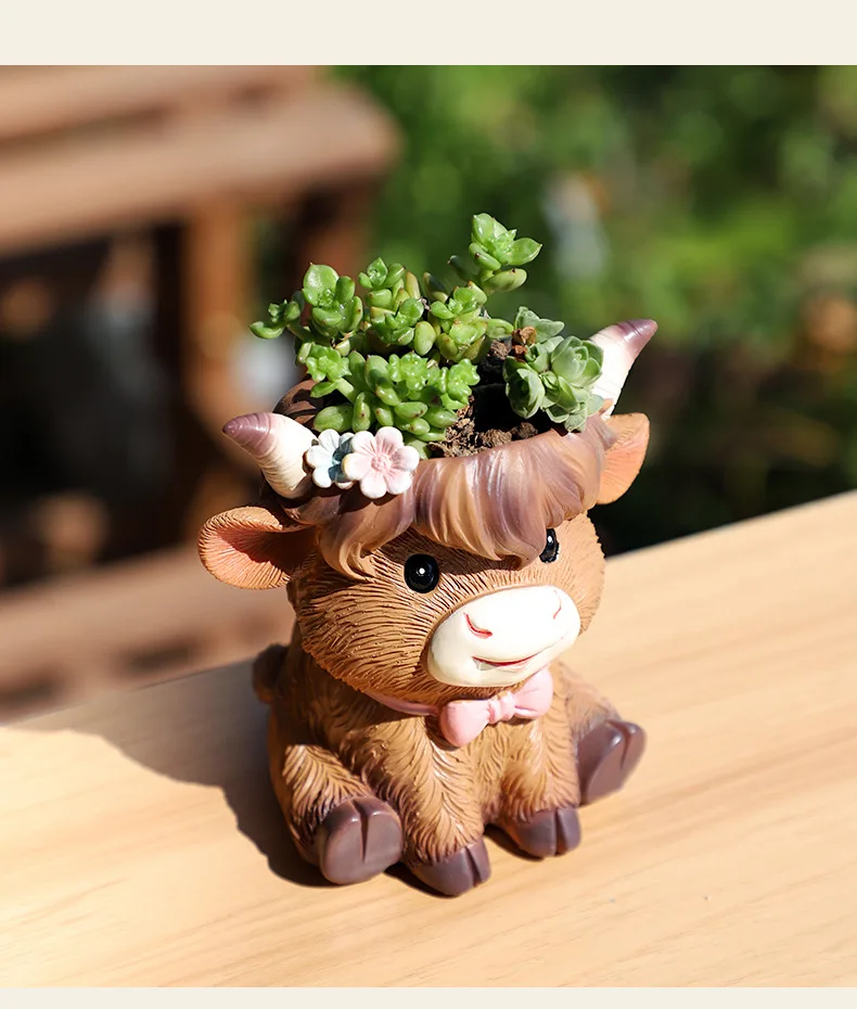 Cute Highland Cow Small Plant Pot Resin Succulent Planter for Home Office Desk Mini Ornament Fairy Garden Flowerpot Decoration